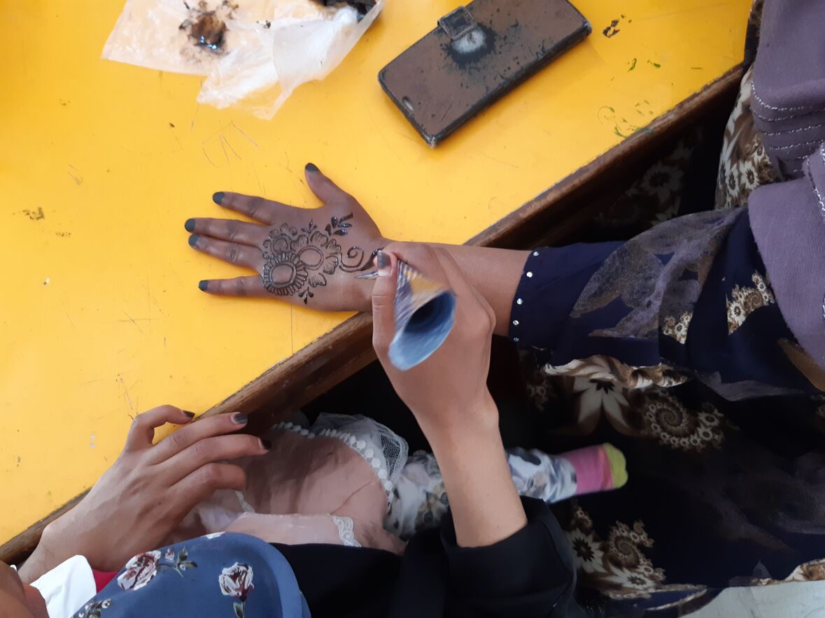 Mit flinker und ruhiger Hand führt die zierliche Frau die schwarze Farbe in feinen Strichen über die Haut. Im Handumdrehen zieren filigrane Blumenmuster und Ornamente die ausgestreckten Hände der zahlreichen interessierten Frauen.